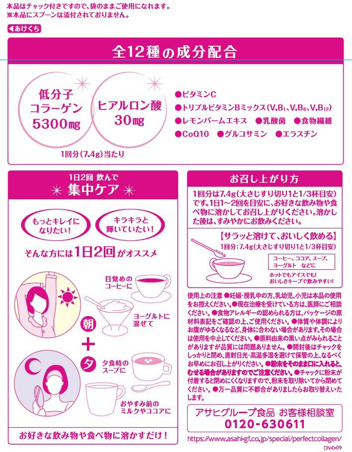●原材料名: コラーゲンペプチド(ゼラチン)、難消化性デキストリン、デキストリン、乳酸菌粉末(殺菌)、植物油脂、コエンザイムQ10、エラスチンペプチド豚由来)、混合ハーブ抽出物(デキストリン、ドクダミ、セイヨウサンザシ、ローマカミツレ、ブドウ葉)、V.C、ヒアルロン酸、香料、グルコサミン(エビ・カニ由来)、糊料(プルラン)、甘味料(アセスルファムK、スクラロース)●栄養成分表示: 1回分(7.4g)あたりエネルギー 25kcal、たんぱく質 5.3g、脂質 0g、糖質 0.56g、食物繊維 1.0g、ナトリウム 17-47mg、ビタミンC 100mg、CoQ10 1.0mg、グルコサミン 10mg●栄養成分表示: 製造時配合(1回分あたり)コラーゲン 5300mg、ヒアルロン酸 30mg、乳酸菌粉末(殺菌) 30mg、エラスチン 1mg