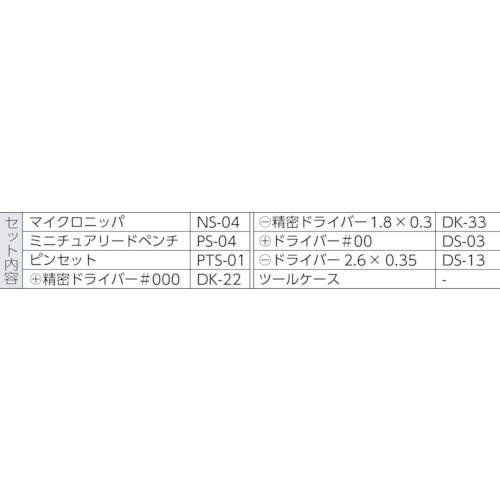 ・NS-04/マイクロニッパー、PS-04/ミニチュアリードペンチ、PTS-01/ピンセット、DM-22/精密ドライバー([[+]]No.000)、DM-33/精密ドライバー([[−]]1.8×0.3mm)、DS-03/ドライバー([[+]]No.00)、DS-13/ドライバー([[−]]2.6×0.35mm)