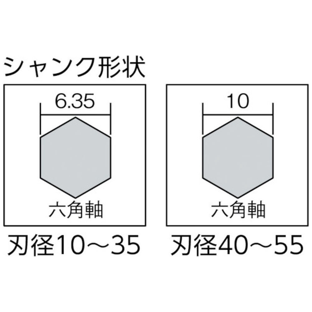 仕様 ■刃径(mm):26 ■溝長(mm):12 ■全長(mm):92 ■シャンク径(mm):6.35 ■斜め切りはφ20mm程度の小径ドリルに限り使用可 ■適正回転数:600〜1300min[[の-1乗]](26386〜26394、26399)、600〜700min[[の-1乗]](26395〜26398) ■適合機種:インパクトドライバー・電気ドリル・ボール盤(26386〜26394、26399)、電気ドリル・ボール盤(26395〜26398) ■正回転使用専用 ■刃部硬度:HRC45±2 ■【材質/仕上げ】 カーボン鋼 ■原産国:中国 ■質量:90G