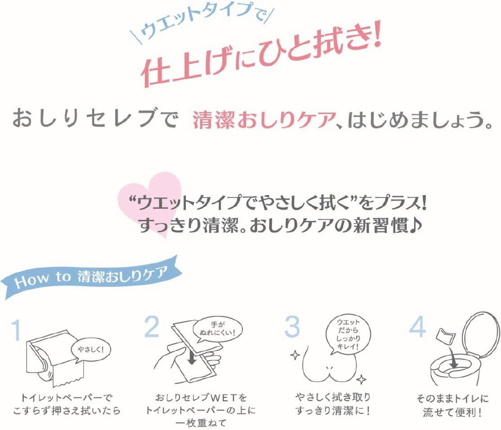 シャワーがなくても、しっとりスッキリ。トイレに流せるおしりの洗浄シート。薬用。