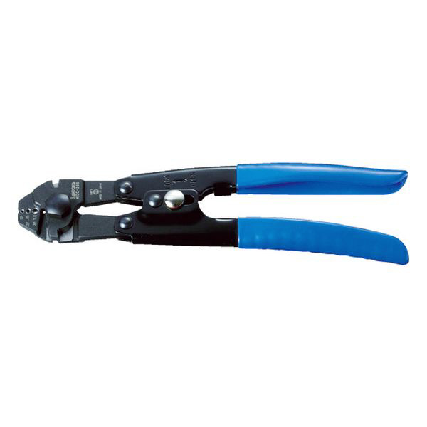 左右2枚の刃でワイヤーロープを切断し、3種の先端穴で各種クランプ管(アルミ管またはオーバルスリーブ)を圧着します