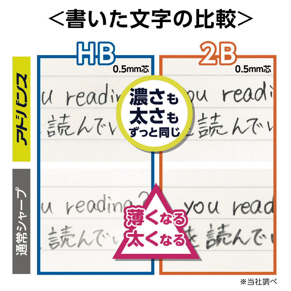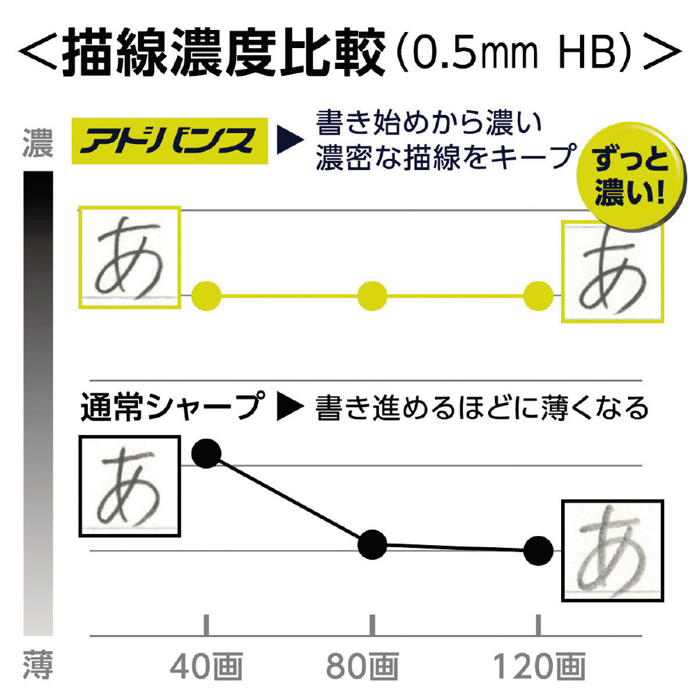 キレイな文字が書ける  文字の濃さも太さもずっと同じ。 キレイな文字を書くために、三菱鉛筆が長い年月をかけて培ってきた技術力のすべてを集結して作り上げたこだわりのシャープ、アドバス。 一度使ったら手放せなくなるような、あなたにとって最高のパートナーとなるシャープの誕生です。