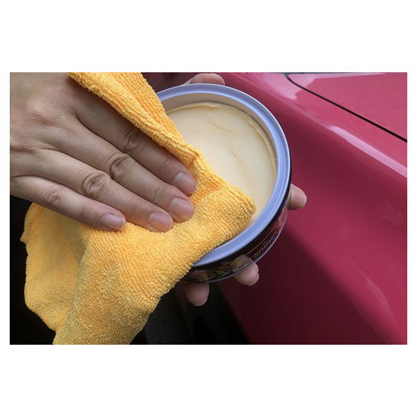 ■ふき取り不要の固形ワックス。付属の専用マイクロファイバークロスで塗り込むだけで鏡のようなクリアーな艶が出ます。