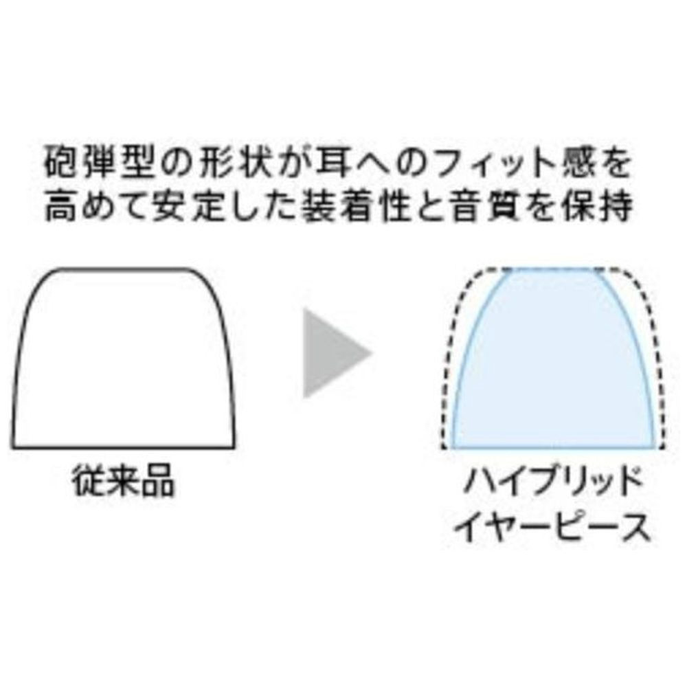 2種類の硬度のシリコンを組み合わせたハイブリッドイヤーピースを採用。芯の部分は硬い素材を用いることで音の通路の形状を保持し、先端の潰れによる音質劣化を防止。外側の部分は柔らかい素材を用いることで耳へのフィット感を向上。密閉度を高め、長時間でも快適な装着性を実現しました。