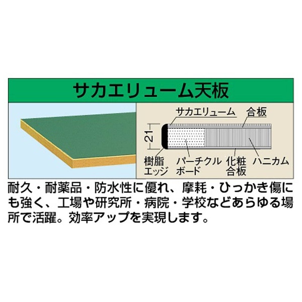 仕様 ■外寸:W1800×D750×H810mm ■内寸:W1530×D528mm ■カラー:サカエグリーン ■質量:39kg ■天板サイズ:1800×750×21mm ■天板材質:サカエリューム天板 ■天板カラー:グリーン ■キャスター:75φゴム車