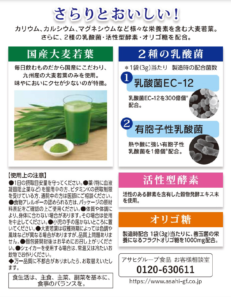 大麦若葉に、2種の乳酸菌・活性型酵素※・オリゴ糖を配合。※活性のある酵素を含有した穀物発酵エキス末を使用。