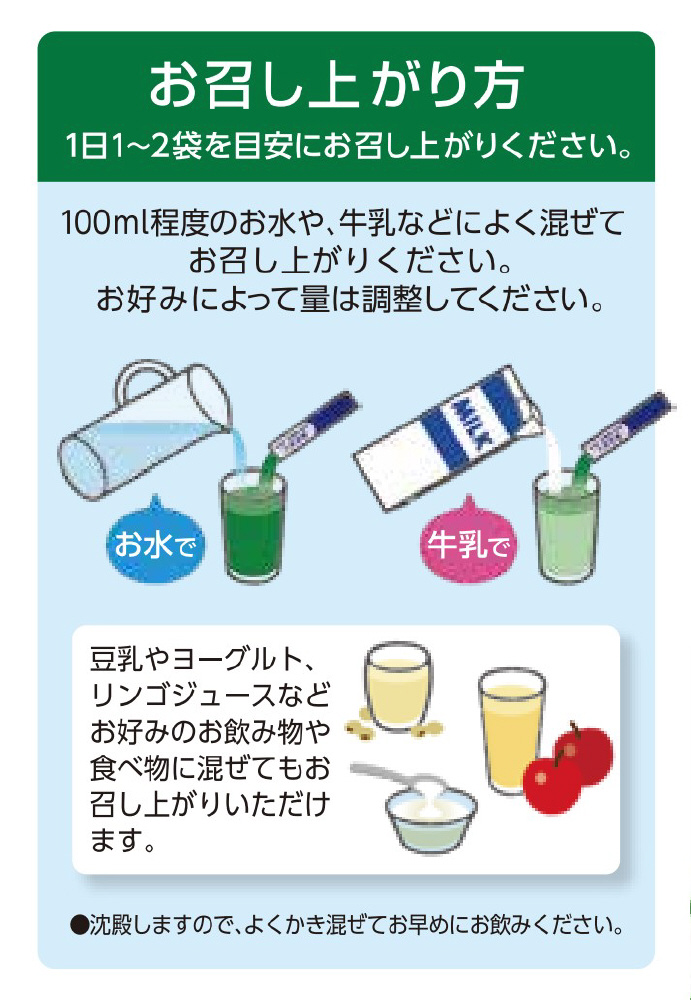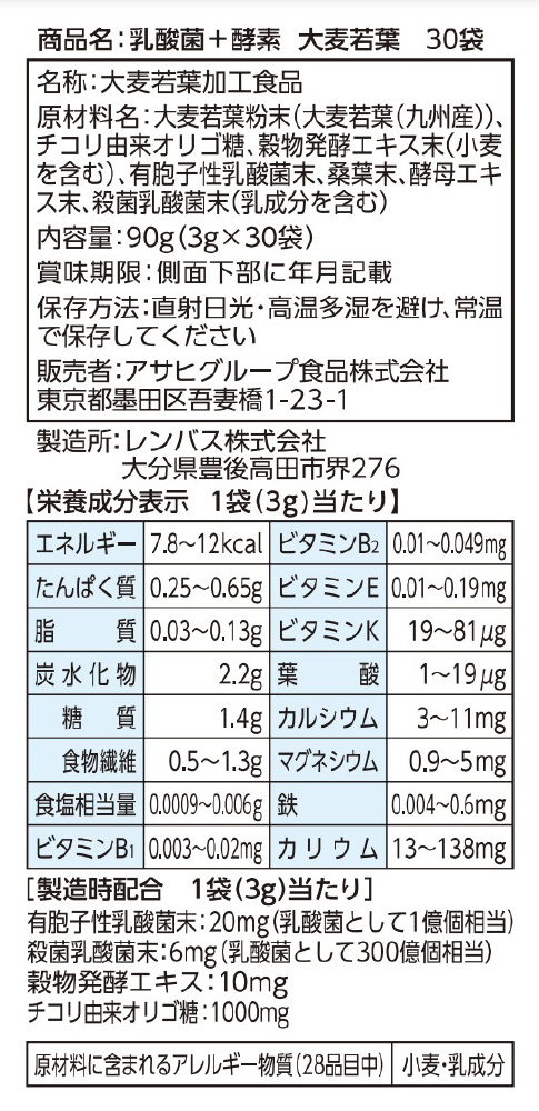 原材料 大麦若葉粉末、チコリ由来オリゴ糖、穀物発酵エキス末(小麦を含む)、有胞子性乳酸菌末、桑葉末、酵母エキス、殺菌乳酸菌粉末(乳成分を含む)