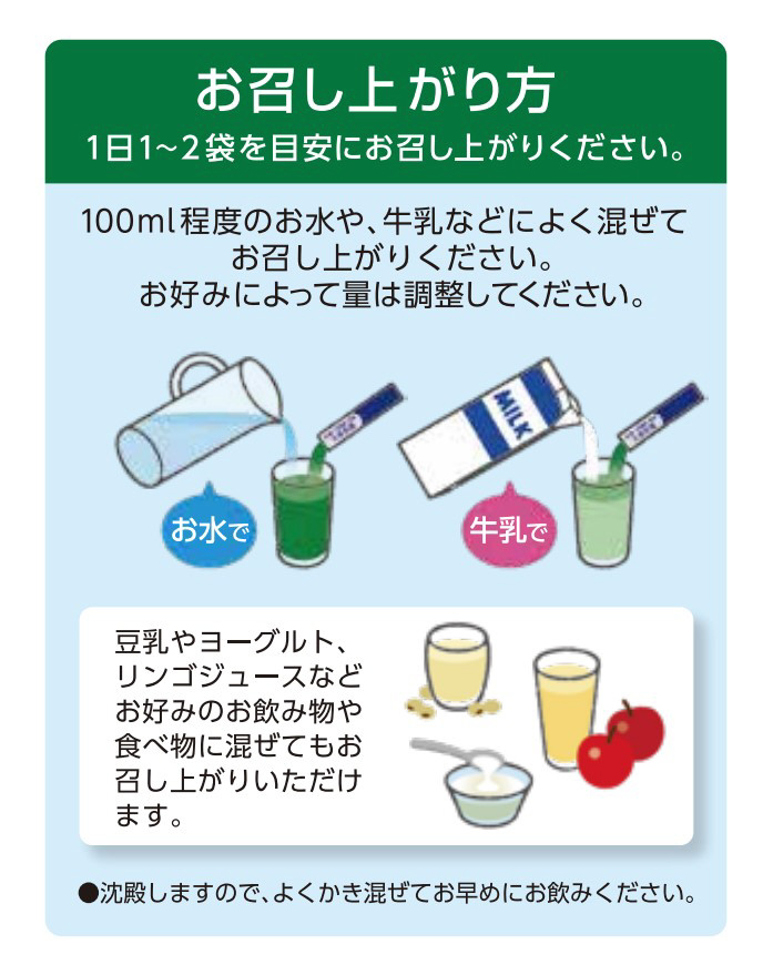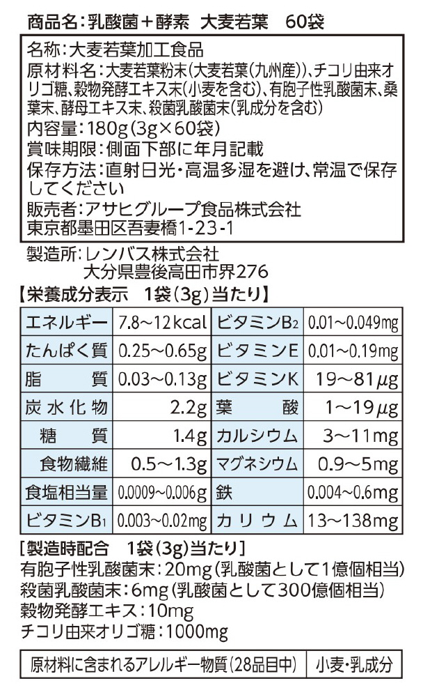 原材料 大麦若葉粉末、チコリ由来オリゴ糖、穀物発酵エキス末(小麦を含む)、有胞子性乳酸菌末、桑葉末、酵母エキス、殺菌乳酸菌粉末(乳成分を含む)