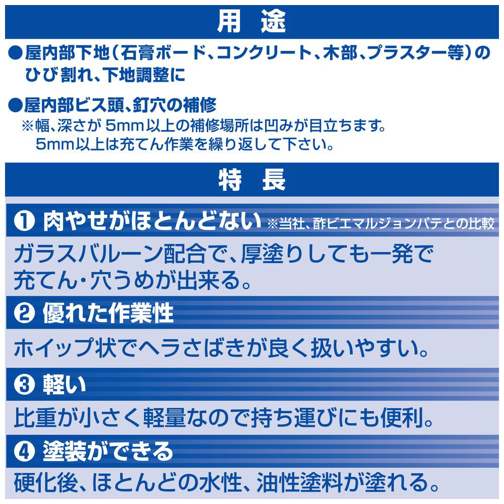 ■ホイップ状で使いやすい、比重の小さい軽量パテです。