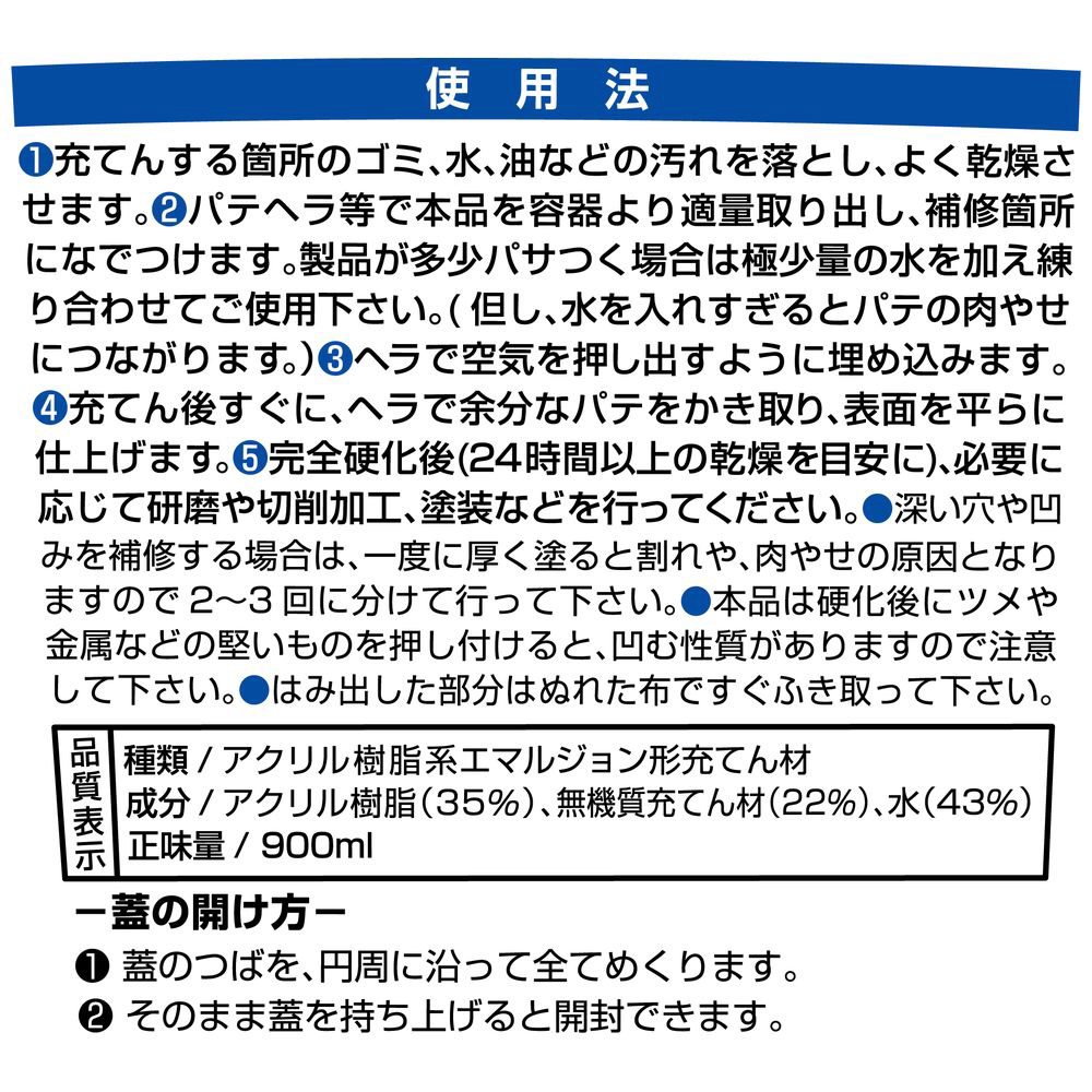 仕様 ■屋内部下地(石膏ボード、コンクリート、木部、プラスターなど)のひび割れに。 ■色:白 ■容量(ml):900 ■【材質/仕上げ】 硬化時間(23℃):24時間 アクリル樹脂系エマルジョン形充てん材 ■原産国:JP ■質量:日本538