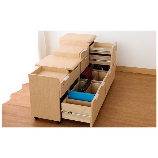 引き出しには取り扱いに便利なフルオープンのスライドレールを採用。収納スペースを機能的にご利用いただけます。下段大引き出しはA4ファイルも収納できます。