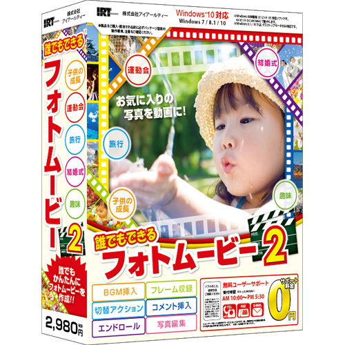 仕様 ■ 対応OS:Windows 7 / 8.1 / 10  ※Mac OSには対応しておりません。 サービスパック 最新のサービスパック(SP)及び各種パッチが 適用されている環境が前提です。 ■ CPU:Intelプロセッサ 2GHz以上(または同等の互換プロセッサ) ■ メモリ:2GB以上 ■ ビデオメモリ:32MB以上 ■ モニター:1024×768以上の解像度で色深度32bit True Color以上の表示をサポートしている環境 ※画面の解像度が1024×768未満、画面の文字サイズ設定によっては 『誰でもできるフォトムービー2』の画面が正常に表示されません。 ■ CD-ROM:倍速以上 ■ ハードディスク:1GB以上の空き容量(インストール時) ※別途データを保存するための空き容量が必要です。 ■ インターネット接続環境必須 ※PDFマニュアルの閲覧ソフトのインストール、アップデートや最新情報の確認の際にはインターネット接続環境が必要です。 【OSについて】 ※上記OSが正常に機能し、OSの最低動作環境を満たしていることが前提です。 ※日本語版32bitOSのみの対応です。各種ServerOSには対応しておりません。 64bitOSでは、WOW64(32bit互換モード)で動作します。 ※Windows 8.1 / 10では、デスクトップモードのみ対応です。 ※最新のサービスパック(SP)及び各種パッチが適用されている環境が前提です。 ※管理者権限を持ったユーザーでお使いください。 ※マイクロソフトのサポート期間が終了しているOSでの動作は保証いたしません。また、IRT社ユーザーサポートも対象外です。