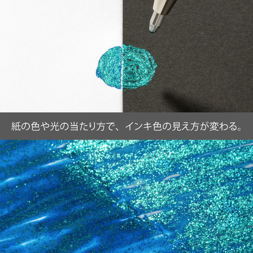 ひとつの線にふたつの輝きを宿す、遊び心あふれるボールペンです。 インクとグリッターの色が異なるため、光の角度や背景の色によって変化して見える色彩を生み出します。