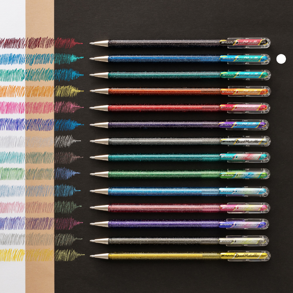 白い紙では鮮やかに、黒などの濃く深い色の紙ではグリッターの輝きがきわだち幻想的に、1本で多彩な表現をお楽しみいただけます。
