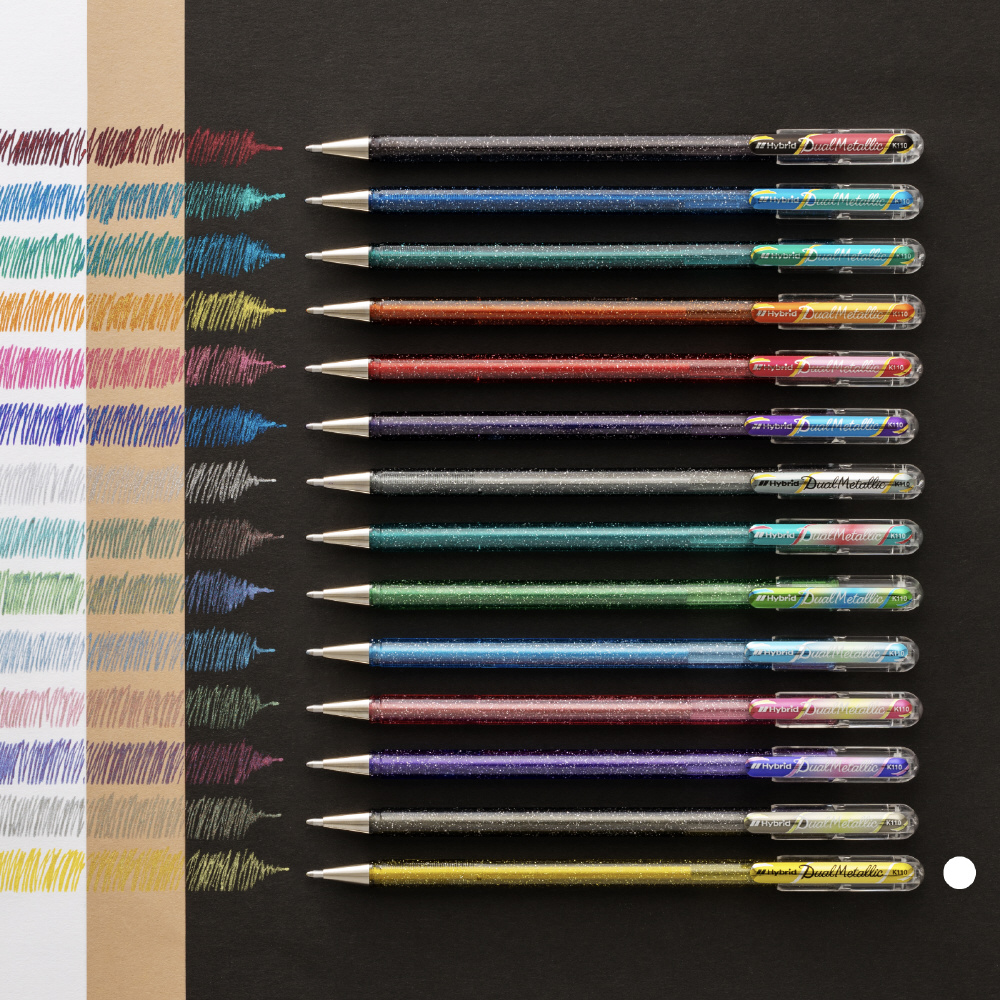 白い紙では鮮やかに、黒などの濃く深い色の紙ではグリッターの輝きがきわだち幻想的に、1本で多彩な表現をお楽しみいただけます。