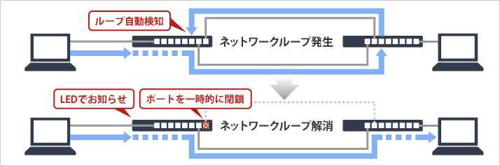 ■ネットワーク運用に大きな障害を及ぼすネットワークのループ構成を検知し、該当ポートを自動的に無効にするループ防止機能を搭載。従来ならば発見が困難で、障害の影響も大きかったネットワークループを迅速に発見し、ループ障害によるネットワーク全体のダウンを自動的に防ぎます。