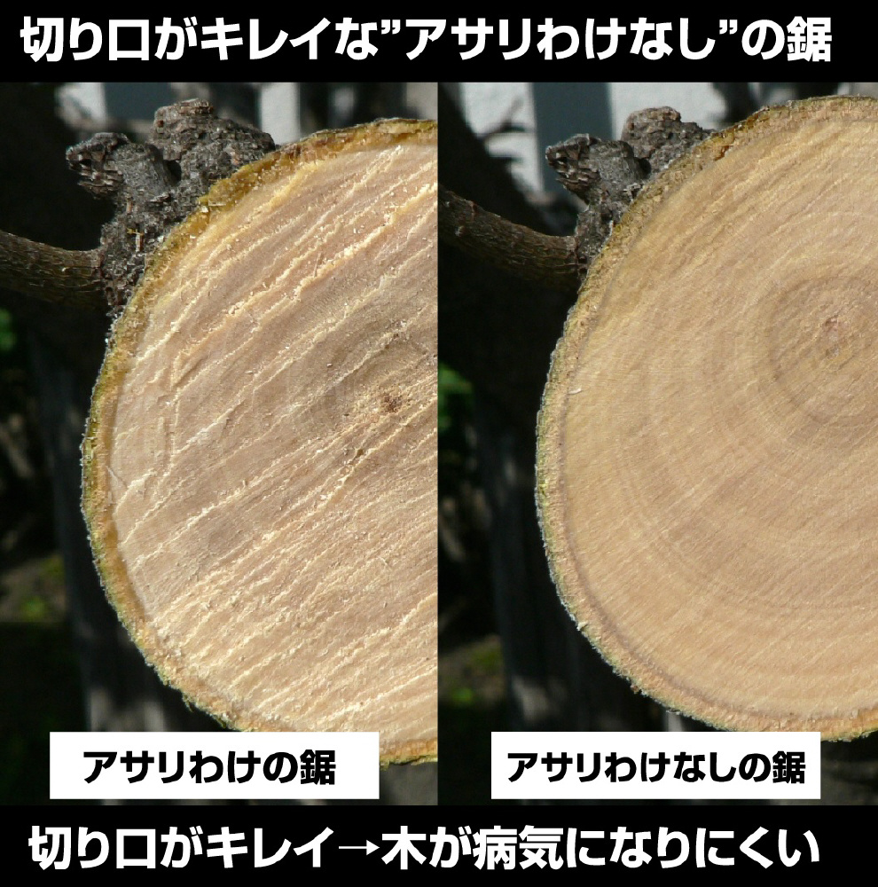 ●「アサリわけなし」の刃によりきれいな切断面で樹木へのダメージを減らし、病気を防ぐ。