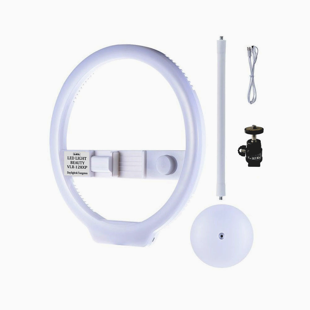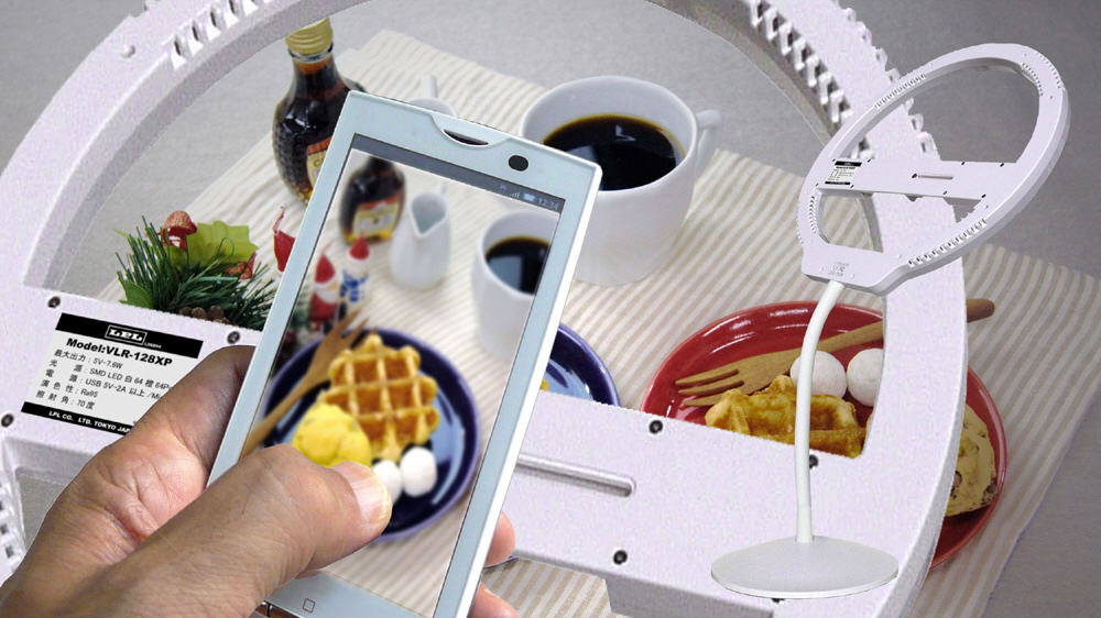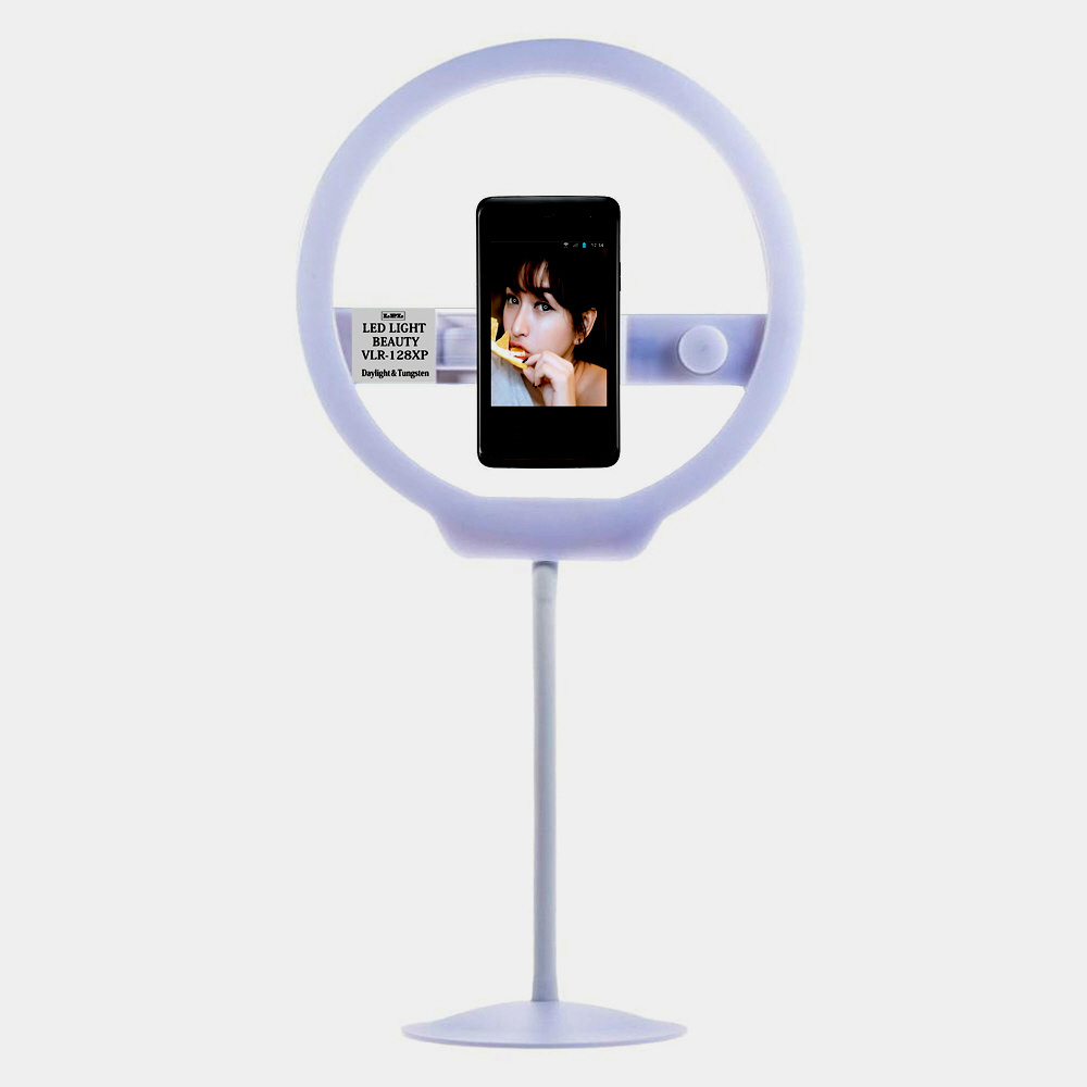 肌の色を明るく、瞳の中にきれいなリングを入れることができるLEDリングライトです。お手持ちのスマートフォンをリング内のホルダーにセットし、ハンズフリーで撮影することができます。固定スタンドは自由に角度調整できるフレキシブル仕様。付属のボールヘッドを使えばカメラシューに取付ができ、一般撮影用ライトとしてもお使いいただけます。