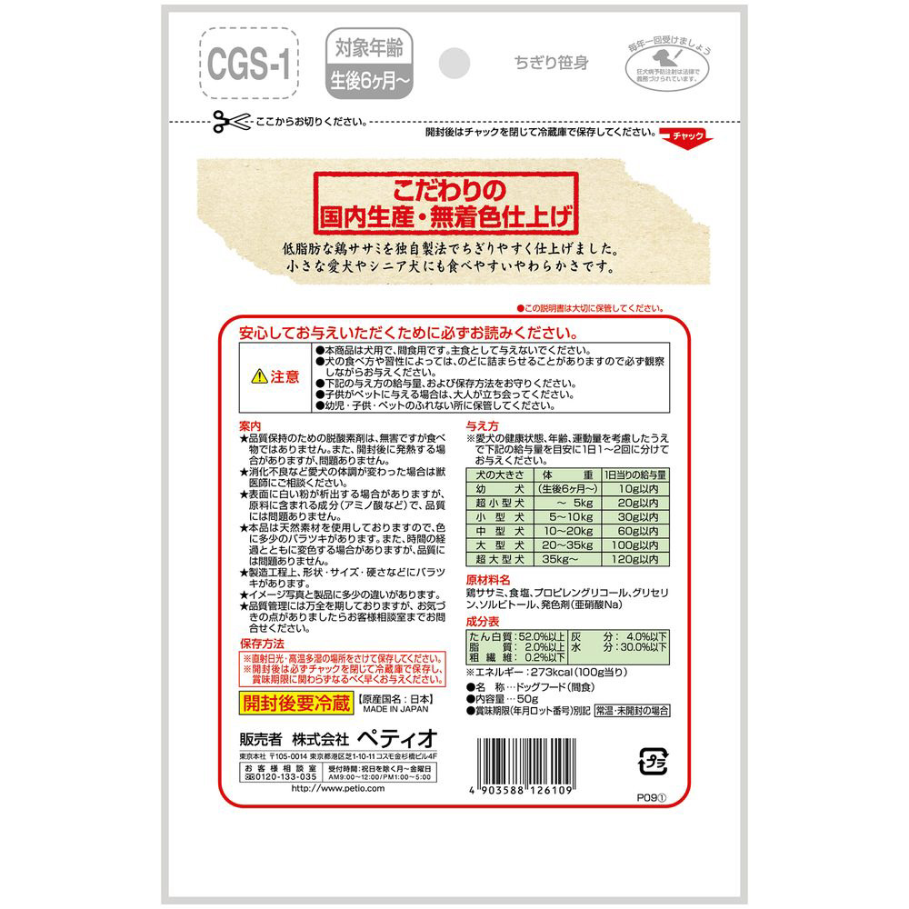 ●低脂肪の鶏ササミを独自製法でちぎりやすく仕上げました。