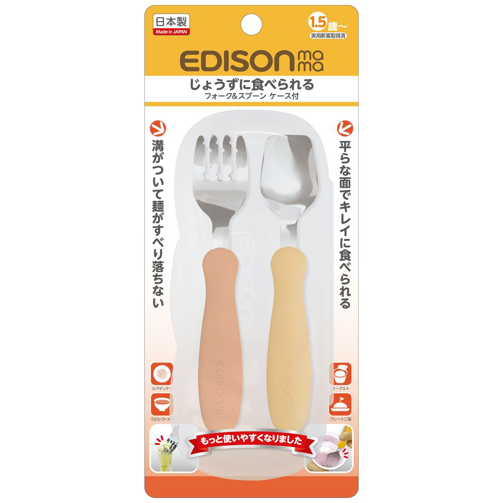 溝がついて麺がすべり落ちないフォークです。食べにくい麺類もしっかりキャッチしひとりで楽しく食べられます。