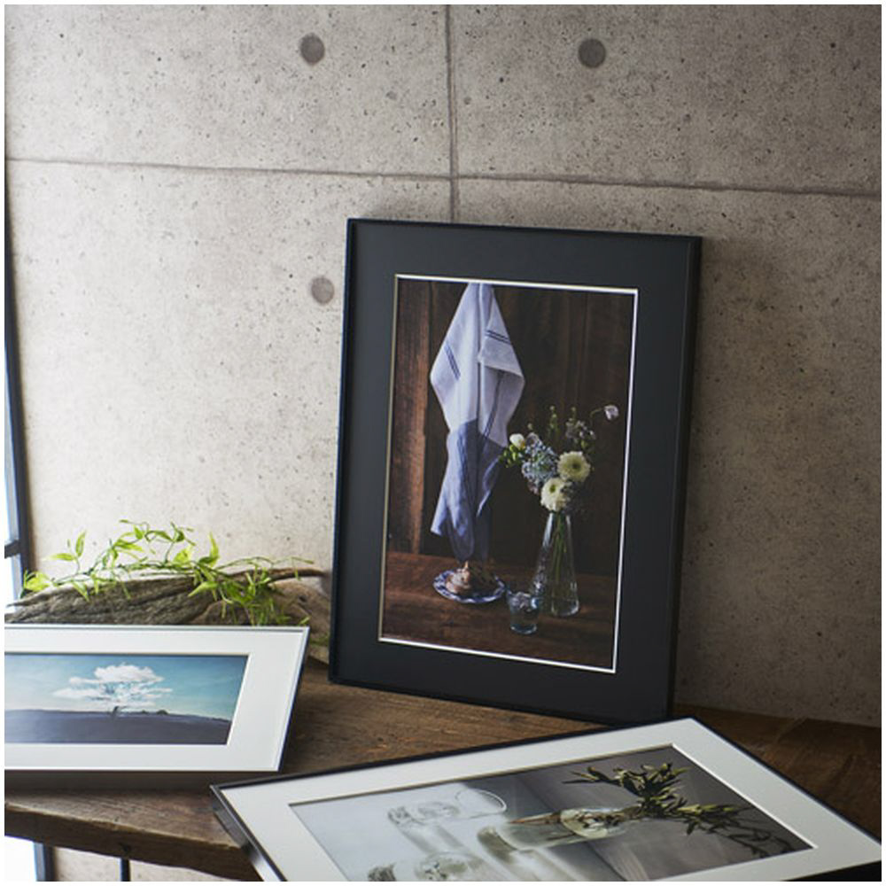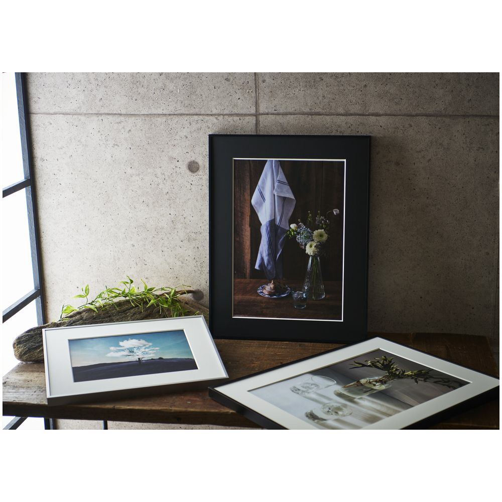 細身のフレームとワイド/Vカットマットにより作品をよりよく見せることができます。大判サイズ(A3/A3ノビ/半切/全紙)の表面板にはアクリル素材を使用していますので、展示会等に最適です。