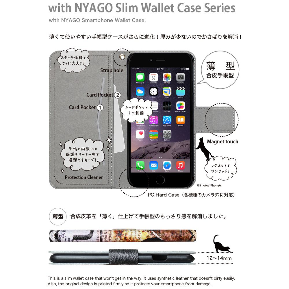with NYAGOはお洒落でかわいい人気の猫デザインブランド。かさばらないスリム手帳型ケース。