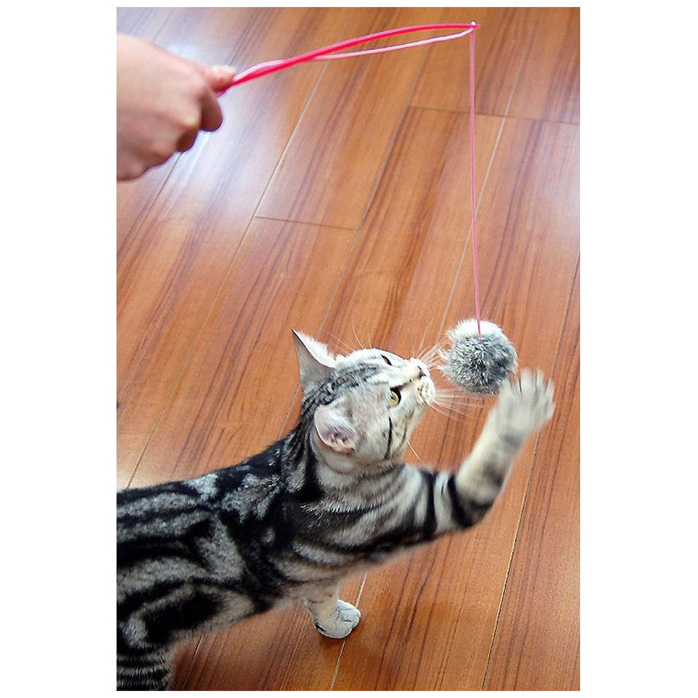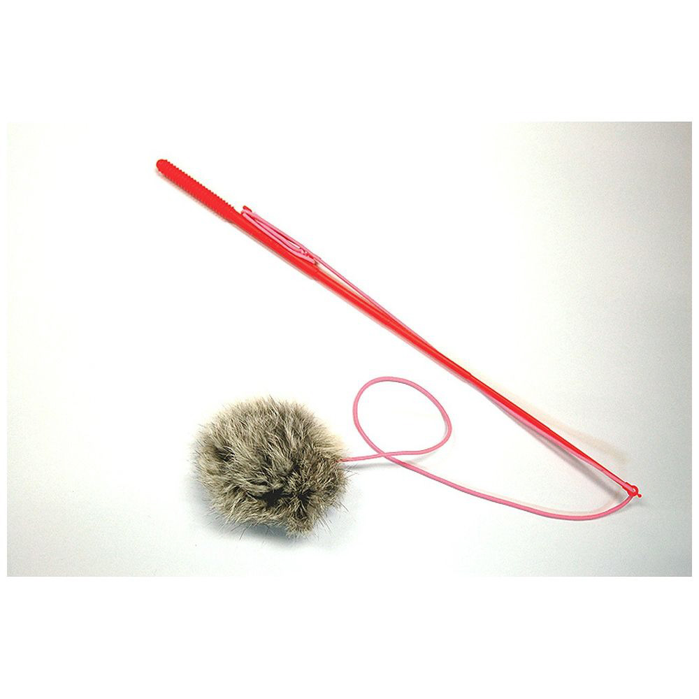 ■くっついているのはウサギ毛の大きなファー!まん丸でゴージャスなモチーフがついた釣り竿タイプのおもちゃです。生きているように動かして、猫の興味を引き寄せます。