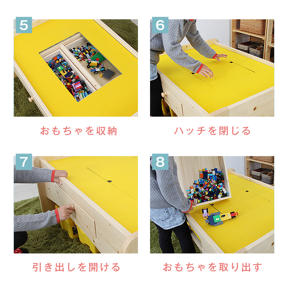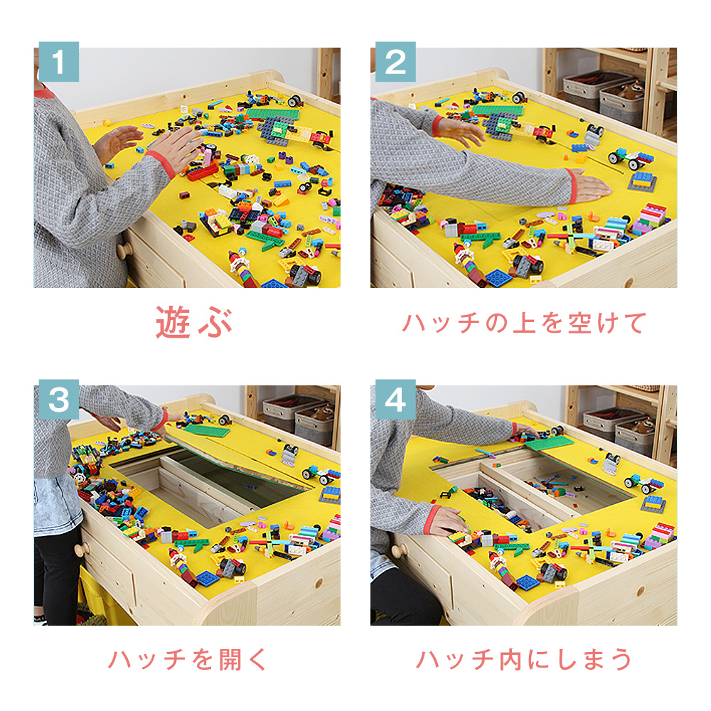 サッとしまえるボックス・引き出し付。楽しく遊べる子供用天然木プレイテーブル