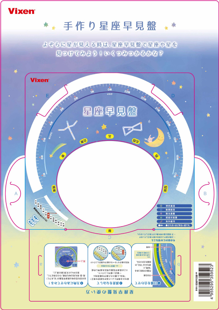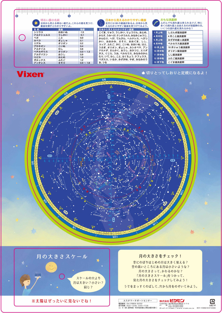 ハサミやカッターを使用することなく、お子様にも10分程度で安全に組み立てることができますので、自由研究やイベントのワークショップにオススメです。シートの余白は、夜空に見つけやすい星の名前と星座の名前、主な流星群の一覧が、栞(しおり)として切り取って使用できるようになっています。また、“月の大きさスケール”は、昇り始めの大きく見える月も、昇って小さく見える月も実際は同じ大きさということがわかる実験ツールです。