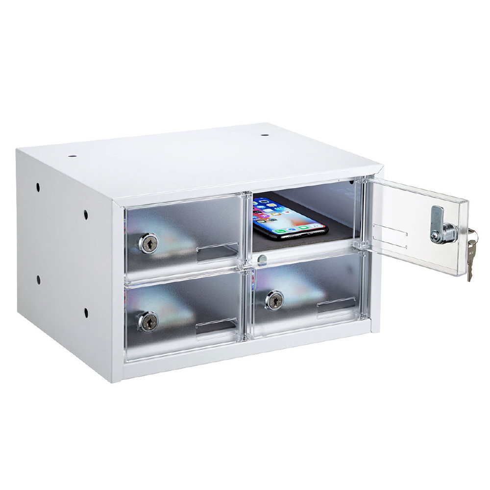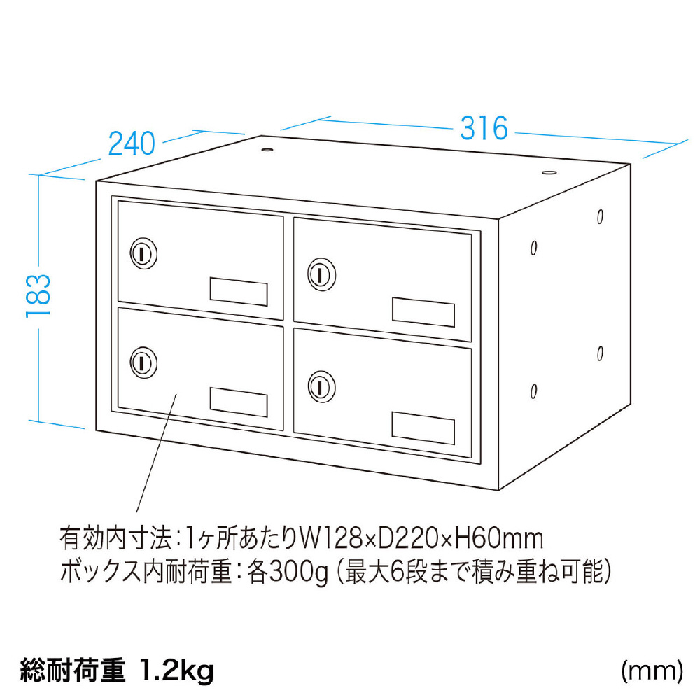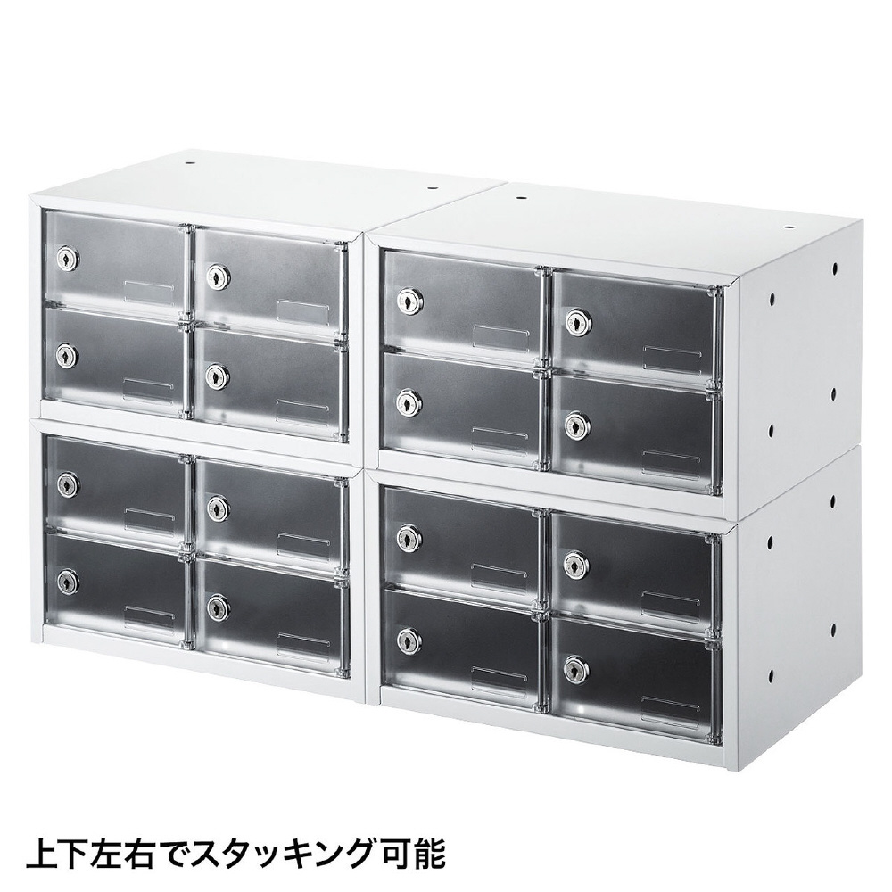 ●スマートフォン収納できる保管庫です。(有効内寸: W130×D220×H60mm/一箇所当たり)〈br〉●正面扉は鍵付です。〈br〉●内部が確認できる半透明の扉を採用しています。〈br〉●上下左右でドッキングさせることができるので、収納台数を増やすことができます。〈br〉●背面にはケーブルを通す穴(直径30mm)があります。〈br〉●盗難防止用のセキュリティワイヤーを通す穴が開いています。
