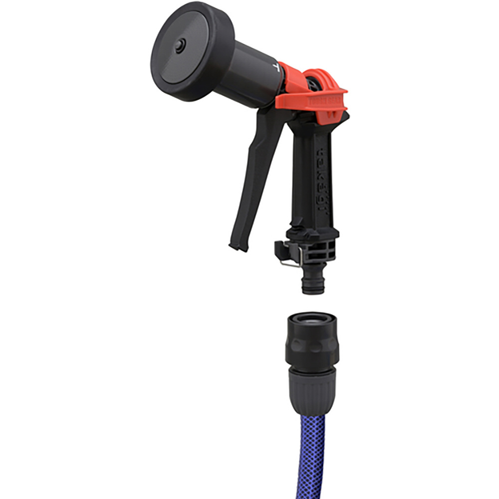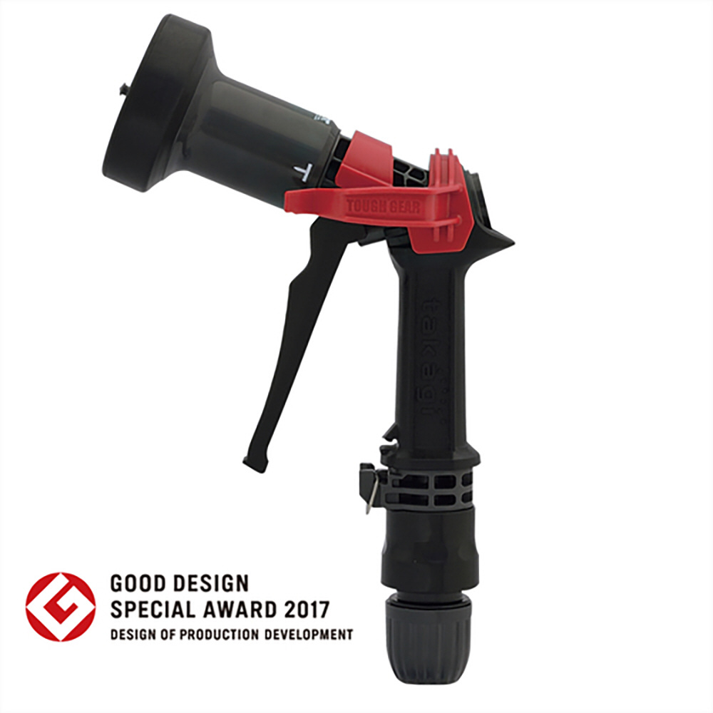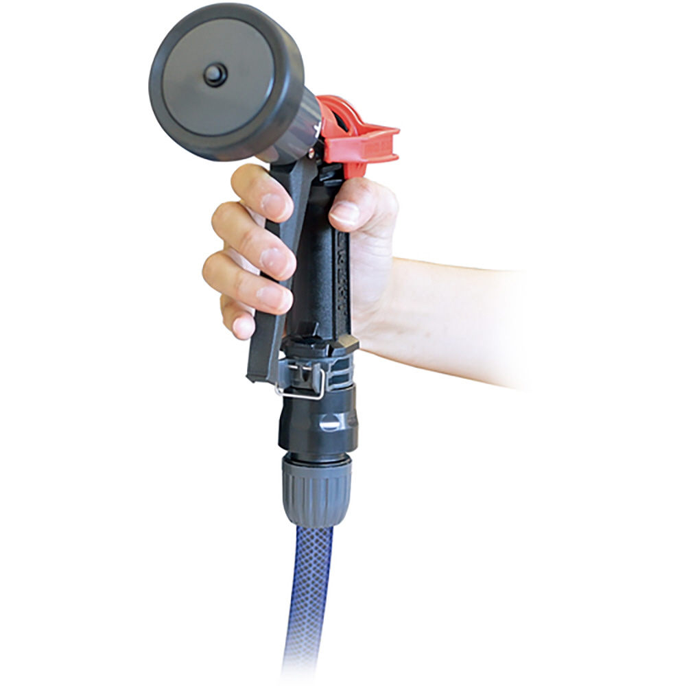 ■吐水レバーを握ると連動してストッパーが自動的にロックするラクロックノズルを採用しています。バケツなどにフックでひっかけることができます。