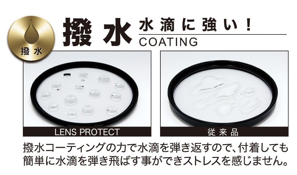 撥水コーティングの力で水滴を弾き返すので、付着しても簡単に水滴を弾き飛ばす事ができ、ストレスを感じません。