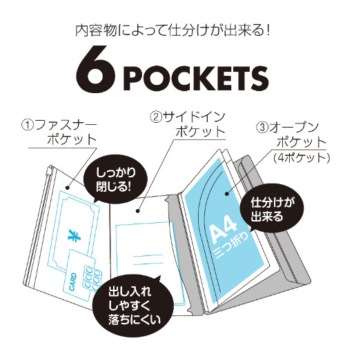 ・内容物によって仕分けが出来る6ポケット仕様(※形の異なる3種類のポケット)