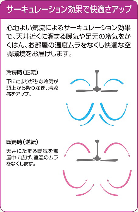 冷房時と暖房時で回転方向を切り替え、快適な空調環境をお届けします。。