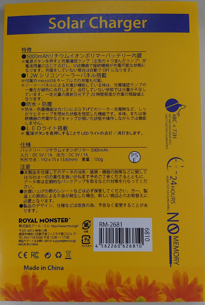 ■1.2Wシリコンソーラーパネル搭載。ソーラーパネルによる充電が可能で、充電が機能している時は充電確認ランプの一番左が赤色に点灯します。点灯していない状態では光量が不足しています。一定光量の直射日光下で20時間程度が充電の理論値となります。※付属のmicroUSBケーブルでの充電も可能
