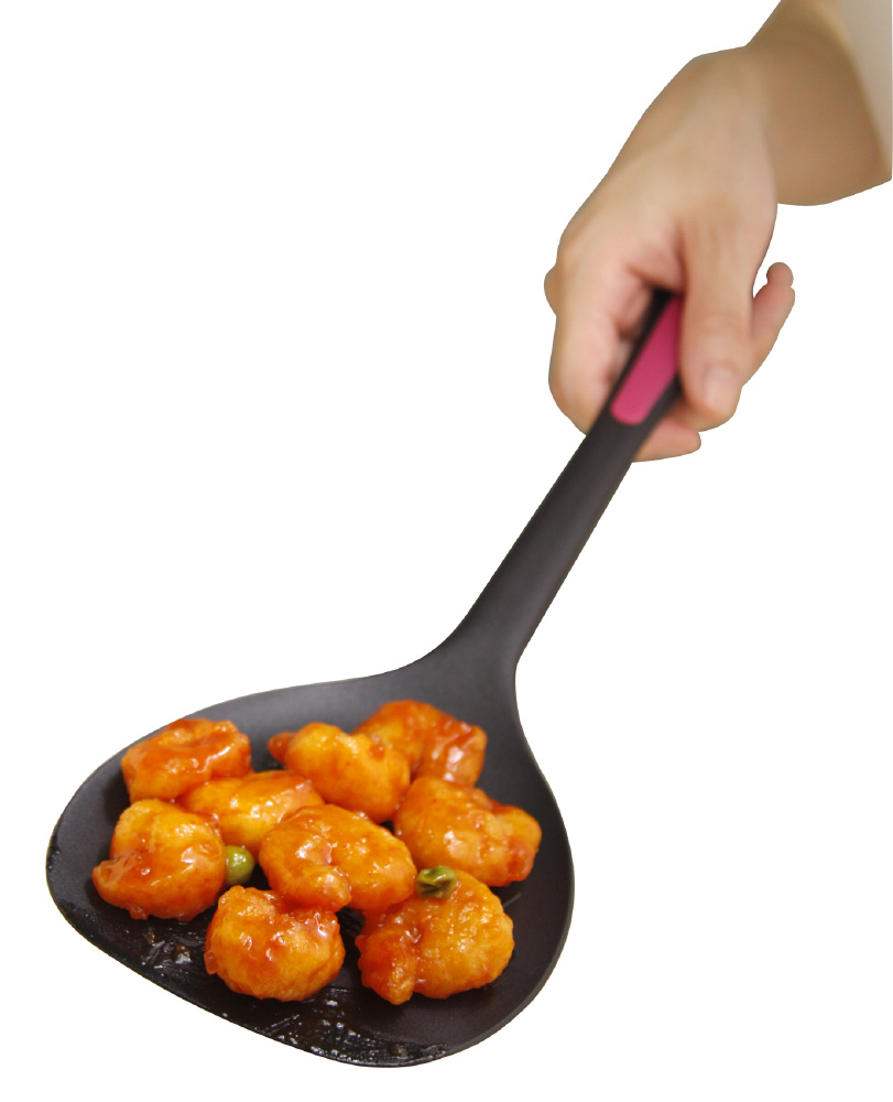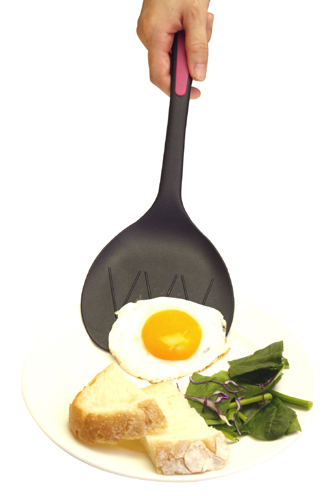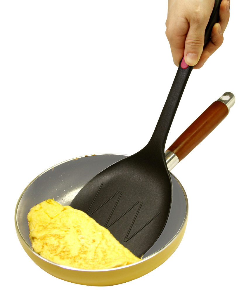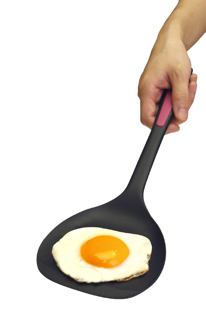 「ペタモ・モコモコ」は、ワイドな面で多くの食材をすくえ、先端の薄い淵が食材の下に入り込みやすく、楽にキャッチできるターナーです。