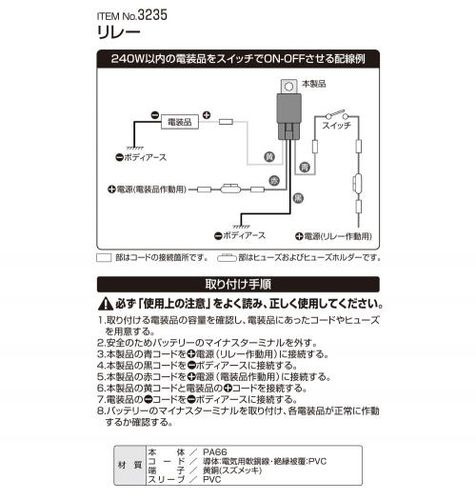 ●リレーを電装品の近くに取り付けておけば、電源コードは最短距離でバッテリーと