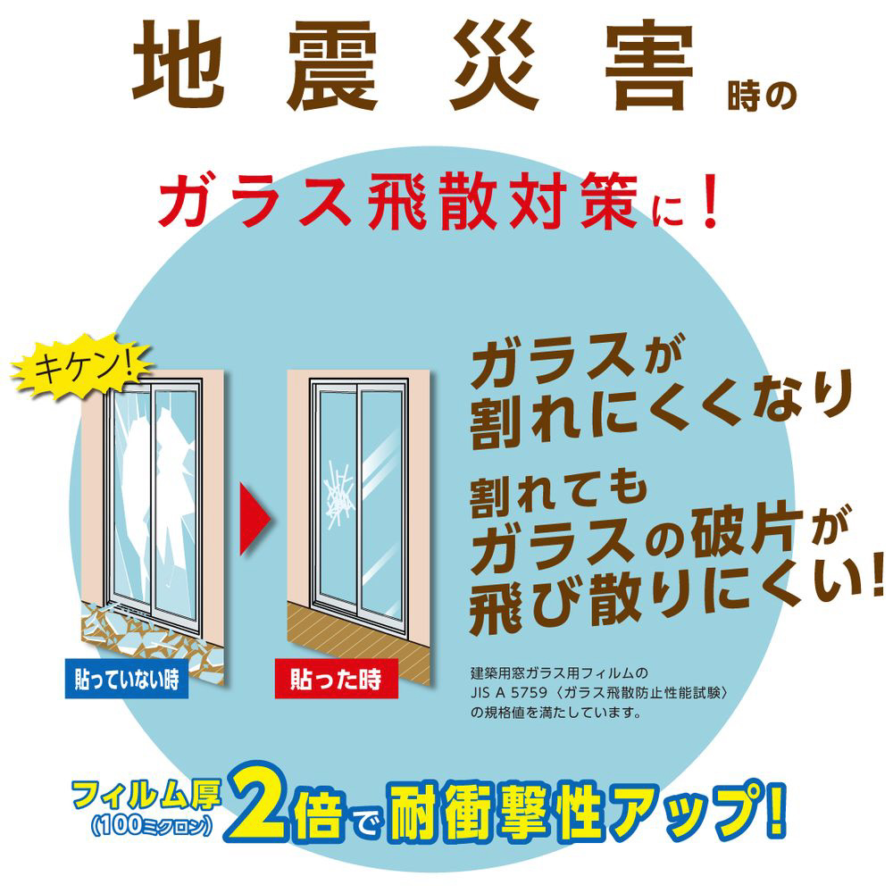 建築窓ガラスフィルムのJIS A 5759(ガラス飛散防止性能試験)規格値を満たしていますので、ガラスが割れにくくなり、割れてもガラスの破片が飛び散りにくくなります。