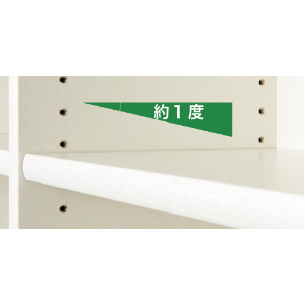 可動棚板は後方に向かって約1度の勾配をつけています。地震の時などに収納物が手前に落下しにくいようになっています。