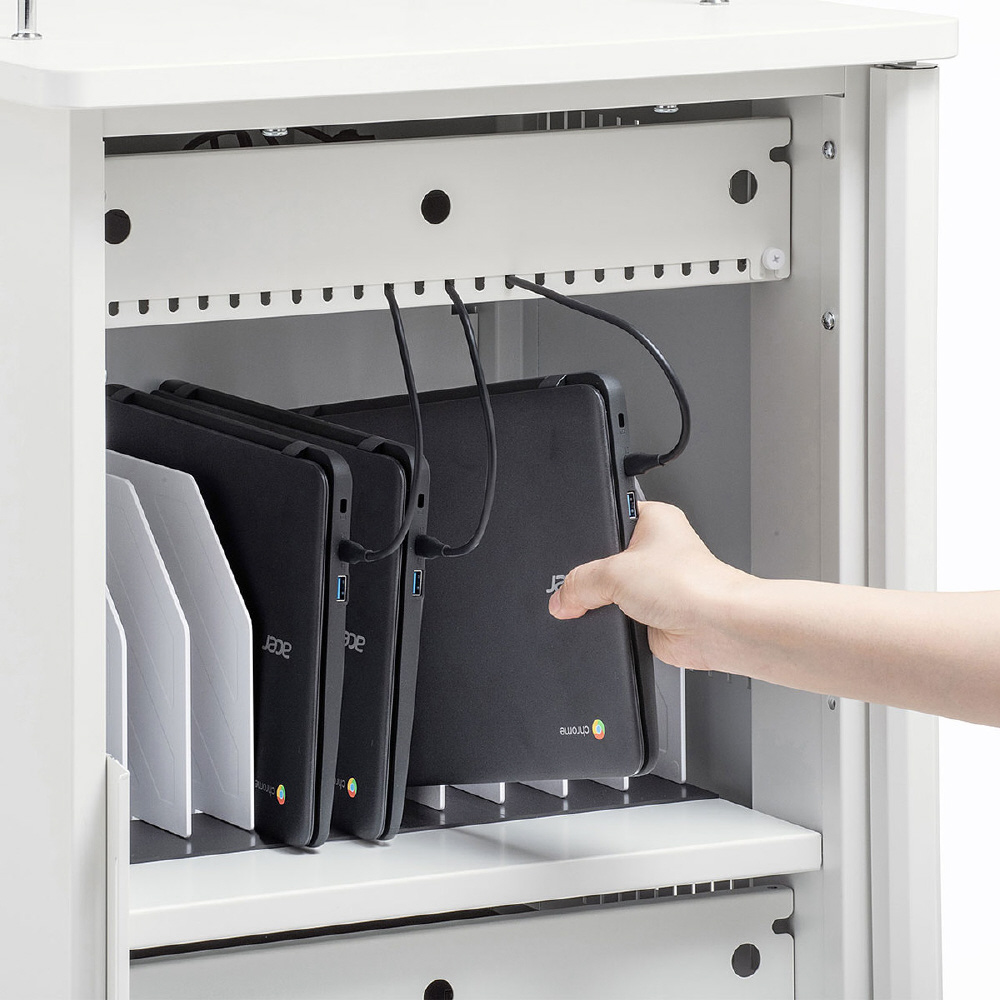 学校導入に配慮した、省スペースにタブレットを22台収納できるキャビネット。