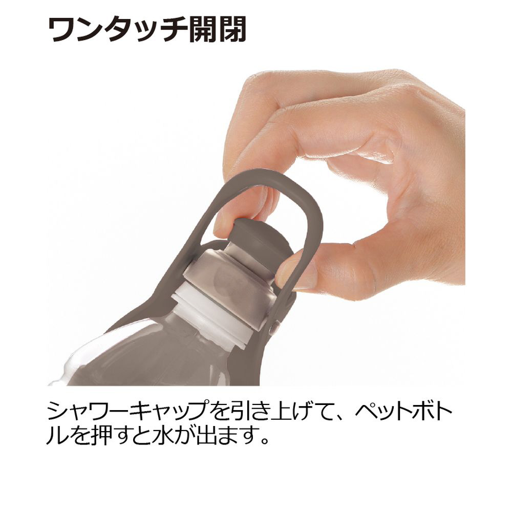 ・ペットボトルに取り付けるだけ。シャワーキャップを引き上げ、ペットボトルを押すだけで手軽に使えます。