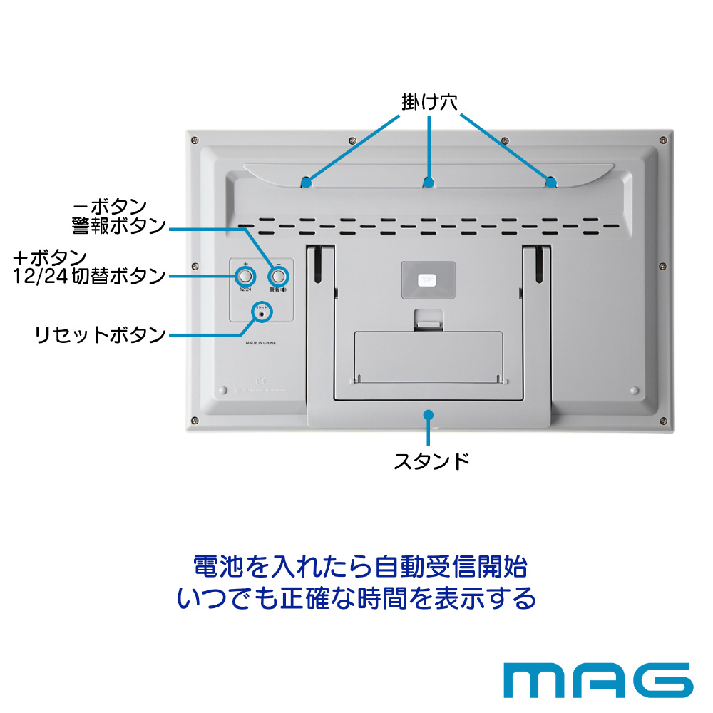 オフィスにも便利な大型サイズのデジタル電波時計。掛けても置いても使える掛置両用モデル。