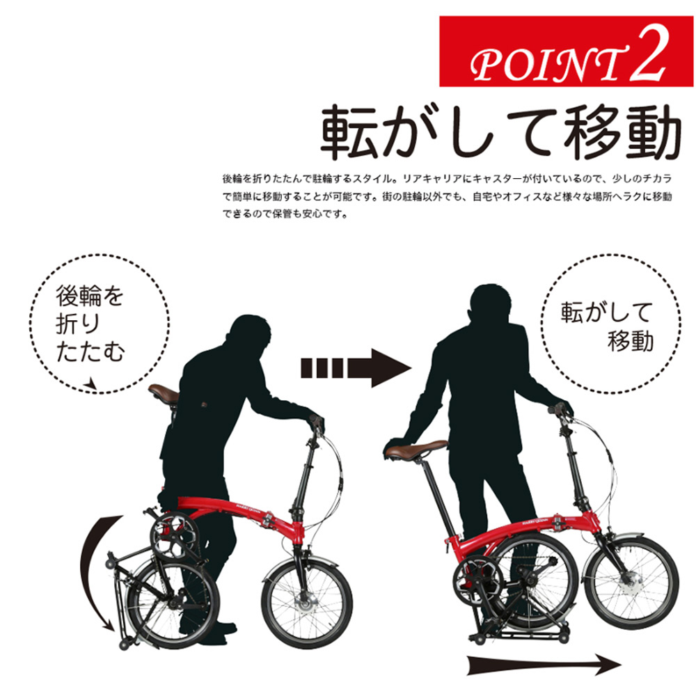 ●リアキャリアにキャスターを装備し、後輪を折りたたんでも移動が楽々。