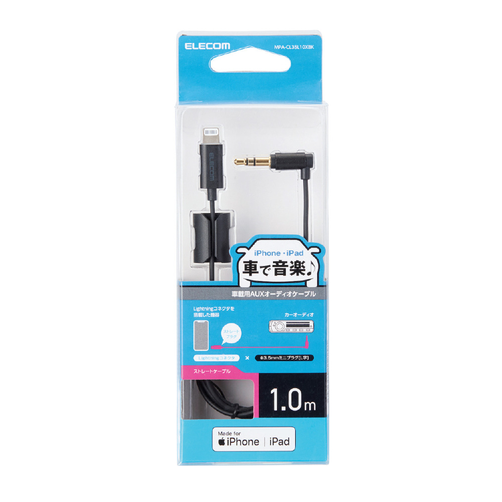 車載用AUXケーブル Lightning-φ3.5オス(L字) スリムデザイン 1.0m ブラック MPA-CL35L10XBK