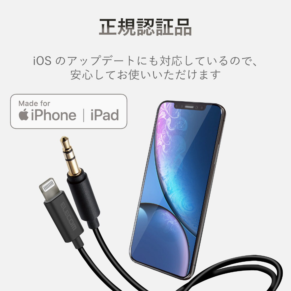 iPhoneやiPadの音楽をスピーカーや車などで楽しめる。 iPhoneやiPadなどのLightningコネクタ搭載機器の音楽をスピーカーやカーステレオで再生するLightning-φ3.5変換AUXケーブル。