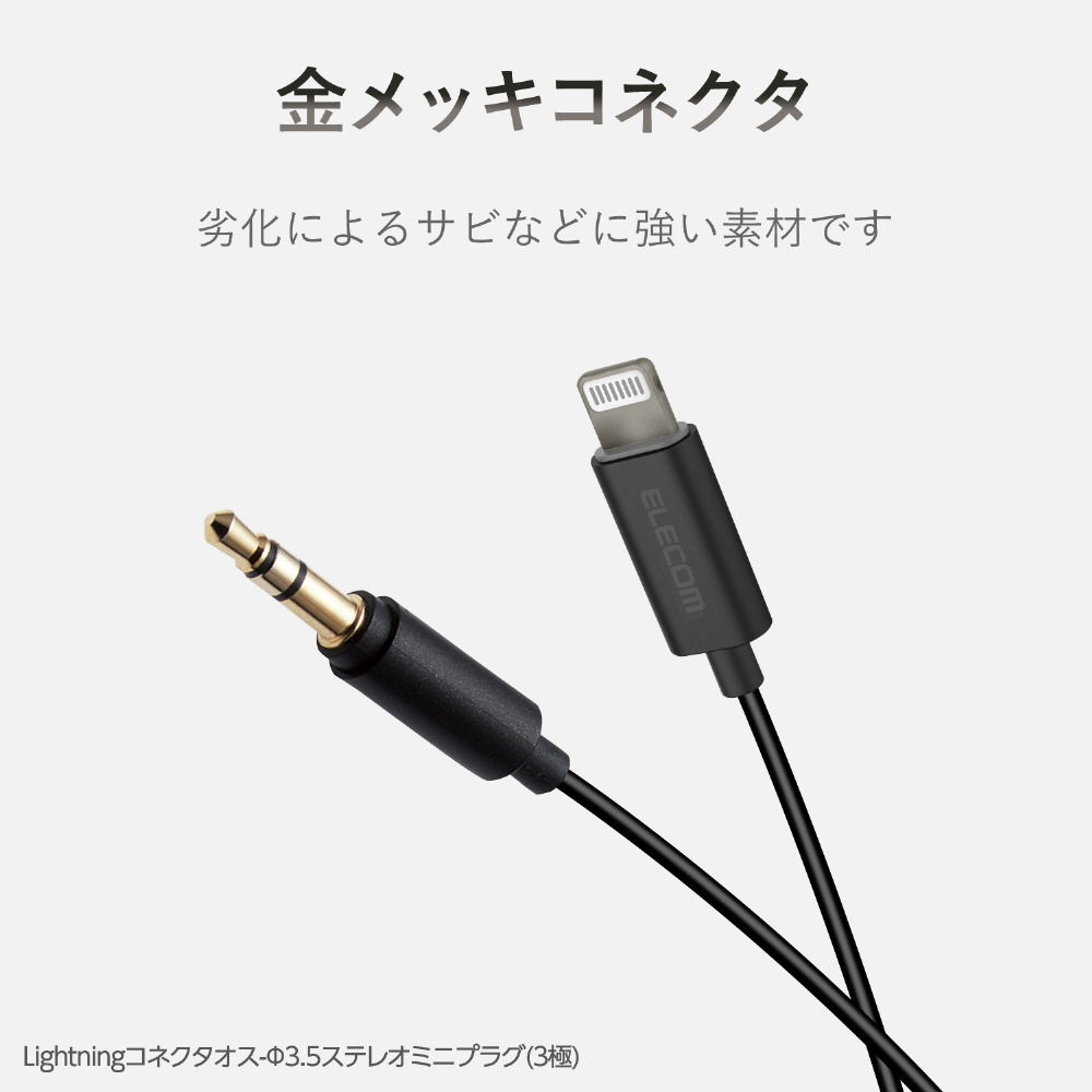 iPhoneやiPadなどのLightningコネクタ搭載機器と、スピーカーやコンポ、カーステレオ、Bluetooth(R)スピーカーφ3.5 AUX INポートを接続することで、手軽に音楽を楽しめるLightning-φ3.5変換AUXケーブルです。