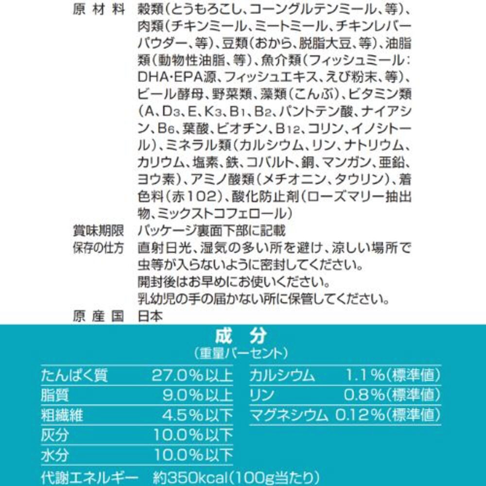 仕様2 穀類(とうもろこし、菓子粉、コーングルテンミール、等)、肉類(ミートミール、チキンミール、チキンレバーパウダー、等)、豆類(おから、脱脂大豆、等)、魚介類(フィッシュミール: DHA・EPA源 、フィッシュエキス、えび粉末、等)、油脂類(動物性油脂 、ガンマ-リノレン酸、等)、ビール酵母、卵類(ヨード卵粉末)、野菜類(野菜パウダー、ほうれん草パウダー、にんじんパウダー、トマトパウダー)、藻類(こんぶ)、