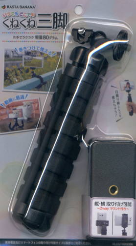 仕様1 三脚の脚の部分はフレキシブルに変形しますので、平面に置くだけでなく、あらゆる場所に巻き付けて固定するなど、従来の三脚とは違う固定方法をとることが出来ます。
