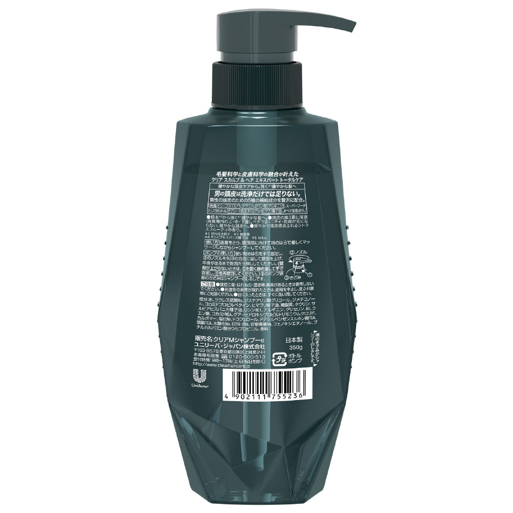毛髪科学と皮膚科学の融合が叶えた、クリア スカルプ&ヘア エキスパート トータルケア。健やかな頭皮ケアから。強く*健やかな髪へ。男の頭皮は洗浄だけでは足りない。 男性の頭皮のための5種の補給成分を配合。頭皮の奥3層に浸透(角質層内の上・中・下層)。ベタつき・ニオイ・乾燥が気にならない、健やかな頭皮と強く*健やかな髪へ。*切れ毛を防ぐ
