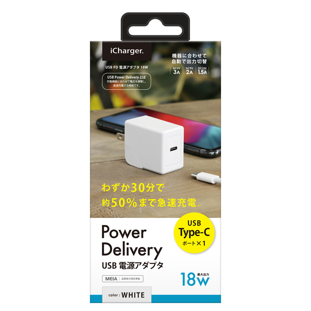 Power Delivery(PD)に対応したUSB電源アダプタです。従来、充電電圧は5V固定でしたが、PDは高い電圧を利用し、また端末機器に適した電圧(本製品では5V、9V、12V)へ自動切替して充電します。高い電圧を利用するPDによりiPhone XSの場合30分の接続で約50%まで急速充電が可能となります。100V〜240Vまでの海外対応も可能。※PD方式で充電するにはご利用の端末機器がPDに対応している必要があります。対応していない端末機器は、従来の充電方式(電圧5V)で充電します。